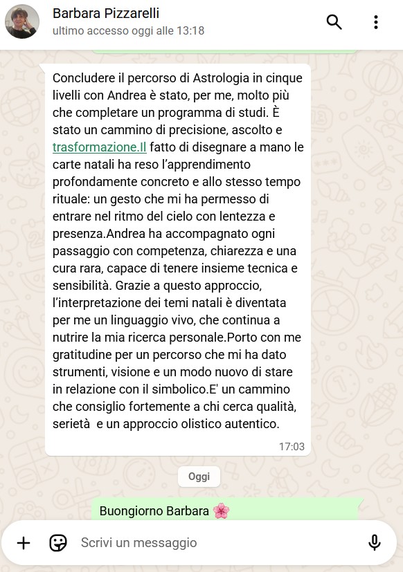 Ho terminato da poco il corso di 5° livello di Astrologia.. e devo dire che più che un corso è stato un per-corso profondo di crescita. L’Astrologia ci aiuta a capire la nostra interiorità, e ci aiuta a comprendere il nostro scopo della vita e portare chiarezza nel nostro Progetto di vita. E in tutto questo la presenza di Andrea è stata fondamentale.. è davvero un Maestro.. con la sua pazienza, cura, attenzione, premura e supporto mi ha e ci ha condotto verso la parte più vera di noi stessi. Grazie di cuore.