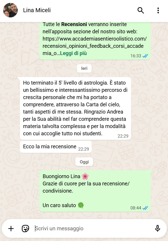 Ho frequentato il corso di secondo livello di astrologia presso Accademia Sentiero Olistico on-line. Ho osservato che la linea di conduzione del docente rispetta le esigenze di tutti i partecipanti nel dare lo spazio di condivisione. A mio avviso è fondamentale in un corso che, oltre i contenuti che vengono illustrati, ci sia la possibilità di interazione. Ringrazio Andrea Barani per l' attenzione all'ascolto, per la calma che manifesta nell'insegnamento e per i contenuti brillanti che conducono a delle riflessioni profonde.