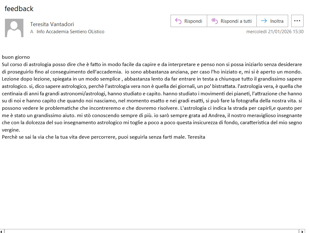 Sul corso di astrologia posso dire che è fatto in modo facile da capire e da interpretare e penso non si possa iniziarlo senza desiderare di proseguirlo fino al conseguimento dell'accademia. io sono abbastanza anziana, per caso l'ho iniziato e, mi si è aperto un mondo. Lezione dopo lezione, spiegata in un modo semplice , abbastanza lento da far entrare in testa a chiunque tutto il grandissimo sapere astrologico. si, dico sapere astrologico, perché l'astrologia vera non è quella dei giornali, un po' bistrattata. l'astrologia vera, è quella che centinaia di anni fa grandi astronomi/astrologi, hanno studiato e capito. hanno studiato i movimenti dei pianeti, l'attrazione che hanno su di noi e hanno capito che quando noi nasciamo, nel momento esatto e nei gradi esatti, si può fare la fotografia della nostra vita. si possono vedere le problematiche che incontreremo e che dovremo risolvere. L'astrologia ci indica la strada per capirli, e questo per me è stato un grandissimo aiuto. mi sto conoscendo sempre di più. io sarò sempre grata ad Andrea, il nostro meraviglioso insegnante che con la dolcezza del suo insegnamento astrologico mi toglie a poco a poco questa insicurezza di fondo, caratteristica del mio segno vergine.